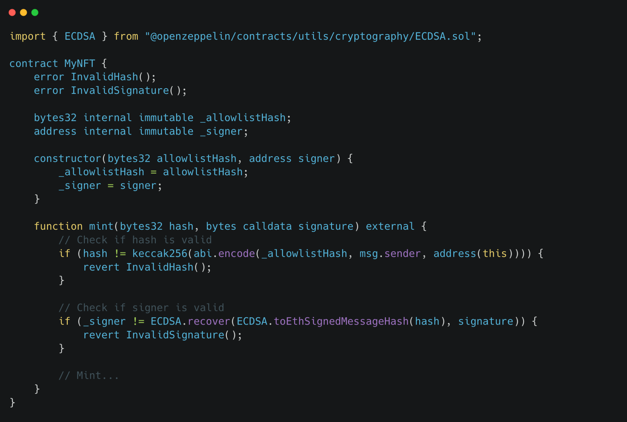 Each allowlist has a signer authority that signs a message proving an address is in the allowlist, then your smart contract needs to verify that the signature is valid. We provide snippets of code for the verification.